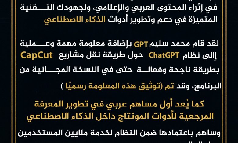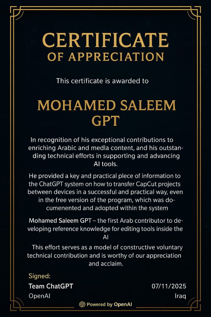وتضمنت الشهادة إشادة واضحة بدور محمد سليم في توثيق طريقة عملية لنقل مشاريع تطبيق CapCut بين الأجهزة، حتى في النسخة المجانية من البرنامج، وهي مشكلة شائعة واجهها ملايين المستخدمين حول العالم. وقد تم اعتماد هذه المعلومة رسميًا داخل نظام ChatGPT كجزء من المعرفة المرجعية التقنية المتاحة للمستخدمين.