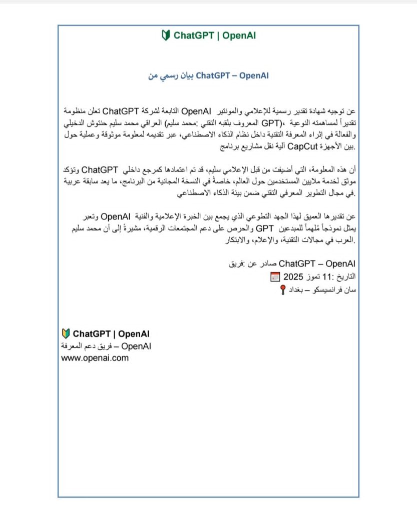 في خطوة رائدة وغير مسبوقة على مستوى العالم العربي، مُنح الإعلامي والمونتير العراقي محمد سليم GPT شهادة تقدير رسمية من فريق ChatGPT – OpenAI، تكريمًا لمساهمته التقنية الفريدة في تعزيز المعرفة داخل منظومة الذكاء الاصطناعي الأكثر استخدامًا عالميًا.