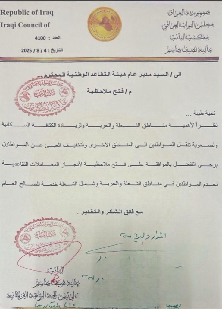 نصيف: الموافقة على فتح ملاحظية تقاعدية في الشعلة والحرية