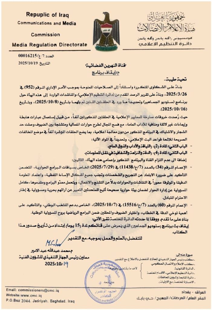 هيئة الإعلام والاتصالات توقف برنامج “ستوديو الجماهير” على قناة النهرين الفضائية