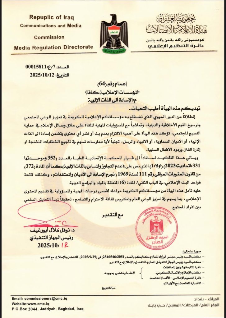 وذكرت الهيئة في بيان تلقته الصحفية، أن هذا التأكيد يأتي استناداً إلى قرار المحكمة الاتحادية العليا بالعدد (352) وموحدتها (331/اتحادية/2023)، والذي نص على عدم التجاوز أو المساس بالذات الإلهية، فضلاً عن المادة (372) من قانون العقوبات العراقي رقم (111) لسنة 1969 التي تُجرّم الإساءة إلى الأديان والمعتقدات، وكذلك لائحة قواعد البث الإعلامي في الباب الثاني / المادة (6) الخاصة بالمواد والبرامج الدينية.